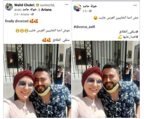 کوڕەکە ناوی وەلید شوکرییە و کچەکەش ناوی خەولە حامدە، لەسەر ئەو وێنەیەی کە لەبەردەم دادگا و دوای جیابوونەوە گرتوویانە نووسیویانە "دواجار جیابووینەوە، ئەوە ئێمە نین کە خراپین، بەڵکو هاوسەرگیری خراپە".ئەوان هەروەها هاشتاگی "سێڵفی_جیابوونەوە" یان لەسەر وێنەکە داناوە.